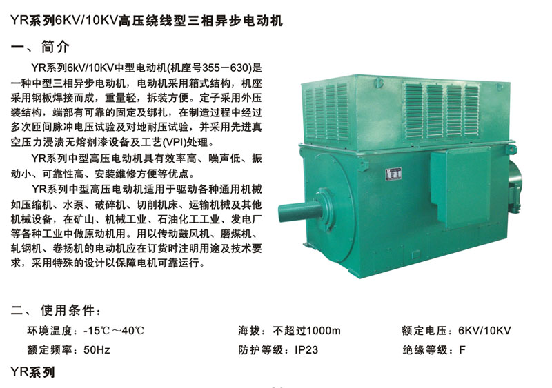 YR系列中型高压电动机具有效率高、噪声低、振动小、可靠性高、安装维护方便等优点。