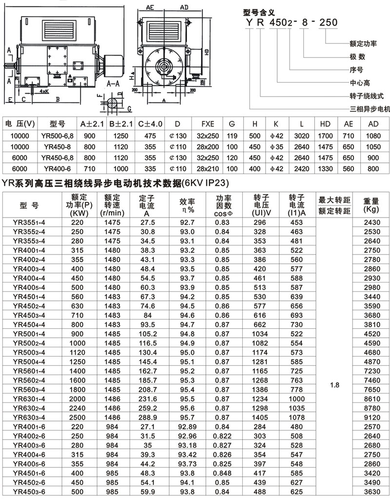 YR系列6kV/10kV中型电动机(机座号355-630)是一种中型三相异步电动机,电动机采用箱式结构,机座采用钢板焊接而成,重量轻,拆装方便。定子采用外压装结构,端部有可靠的固定及绑扎,在制造过程中经过多次的匝间脉冲电压实验及对地耐压试验,并采用先进真空压力浸渍无溶剂漆设备及工艺(VPI)处理。
